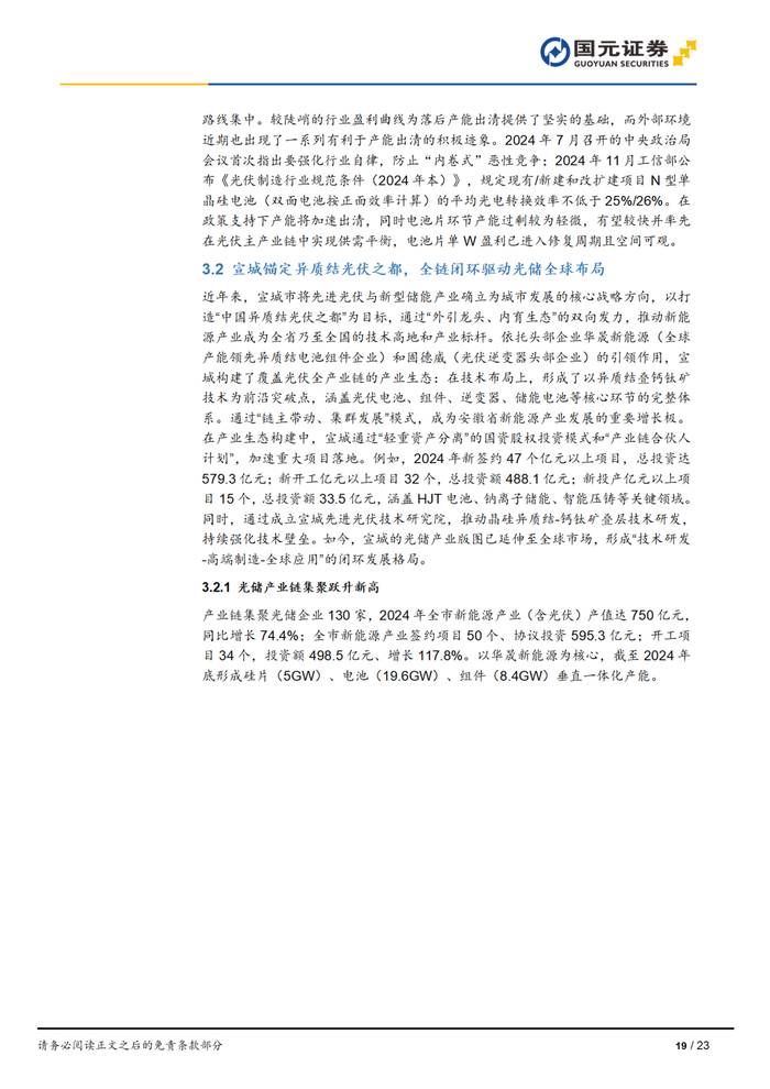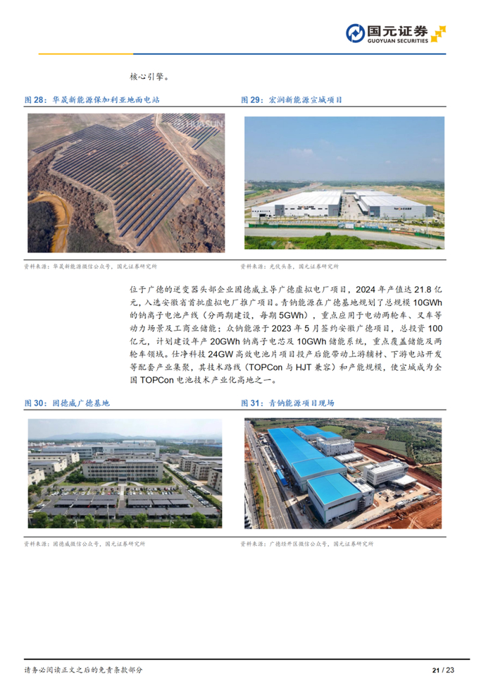 宣城市依托头部企业华晟新能源(全球产能领先异质结电池组件企业)和固德威(光伏逆变器头部企业)的引领作用:1)在光伏领域形成了以异质结叠钙钛矿技术为前沿突破点,覆盖光伏全产业链的产业生态。2)在储能方面,通过推进固德威10GWh储能电池、吉利30GWh动力电池、青钠科技钠离子电池三大基地建设,以及2024年阳光新能源62亿元半固态电池项目落地,形成锂/钠/固态电池技术并行发展格局。
