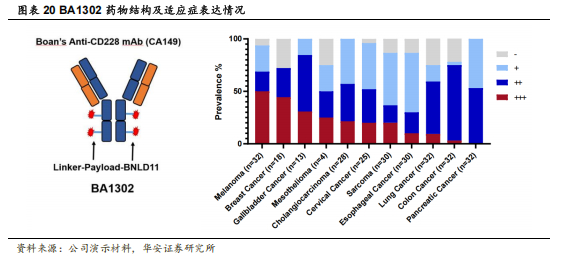 博安生物自主研发的BA1302作为国内首个进入临床阶段的抗CD228 ADC药物,并为当前全球唯一处于临床阶段的靶向CD228的ADC药物。BA1302通过创新的结构设计实现精准抗肿瘤效应。采用可裂解的葡萄糖醛苷酸连接子将细胞毒素MMAE与靶向CD228的单抗偶联,利用抗体特异性识别肿瘤细胞表面高表达的CD228抗原,引导毒素定向富集于肿瘤微环境,经溶酶体切割释放MMAE以杀伤肿瘤细胞,同时通过旁观者杀伤效应穿透肿瘤异质性屏障,增强对周边低抗原表达或基质包裹癌细胞的清除能力。相较于传统化疗,BA1302凭借高药物暴露量和低系统性毒素释放,将治疗指数窗口拓宽,显著提升安全性。该产品于2024年7月获中国IND批准,同年11月完成首次人体给药(FPI),并已获得FDA Pre-IND积极反馈,正在筹备美国IND申报;临床前数据显示,BA1302在黑色素瘤、肺癌、胃癌、结肠癌、间皮瘤、胰腺癌、乳腺癌等CD228阳性实体瘤的PDX模型中均展现显著疗效,且与PD-1抗体联用可进一步增效。作为全球进度领先的CD228靶向ADC,其目标适应症覆盖晚期黑色素瘤、肺癌、胃癌等高发瘤种,有望为缺乏有效治疗手段的实体瘤患者提供突破性选择。