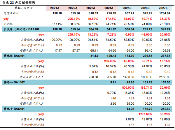 公司收入主要来自已上市(博优诺、博优倍及博洛加)以及即将上市(博优平、博优景)的生物类似药销售,我们以实际/预计年治疗费用及实际/预计的用药人数计算各产品销售额,基于此得到公司整体产品销售预测,较远期上市的产品暂不计入销售预测模型。其中考虑到博优诺由于竞争格局及政策原因,有可能在未来2~3年内经历生物药集采,我们假设2026年生物药集采将影响其单价进而影响销售收入及毛利率。预计25年许可收入大约5000万元,26年及以后由于具有不确定性,对许可收入不做预测。