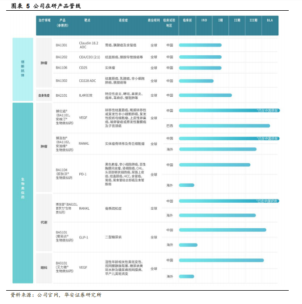 公司通过多元化的对外合作策略显著提升了研发效率、生产质量及商业化能力,形成了全产业链的协同优势。商业化领域,公司采取“授权+联合推广”模式,将地舒单抗(博优倍)在中国大陆的推广权授予正大制药青岛,将阿柏西普(博优景)在中国大陆的推广权授予欧康维视,借助两家合作伙伴分别在骨松和眼科领域的终端覆盖能力快速放量;新兴市场方面,公司与多个南美和东南亚合作伙伴签署授权协议,利用本地资源推动产品在当地市场的注册与销售。研发端,公司授予健康元开发和商业化长效IL-4Rα单抗BA2101的呼吸系统适应症权利,依托健康元在呼吸领域的市场资源加速项目推进多元化对外合作帮助公司加速创新药与生物类似药全球化布局,形成“研发-生产-销售”闭环的竞争优势。