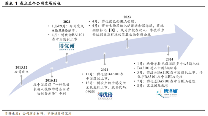 发展阶段:从成立初期的技术研发,到产品上市及市场拓展,逐步构建起完整的产业链。成立初期,博安生物致力于研发技术平台,随着技术的成熟和产品的开发,开始进行产品上市和市场推广,逐渐形成了集研发、生产、销售为一体的完整产业链。