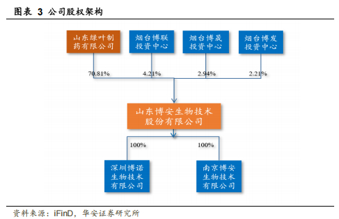 山东博安生物技术股份有限公司的股权架构清晰,主要由山东绿叶制药有限公司、烟台博联投资中心、烟台博晟投资中心和烟台博发投资中心共同持有。其中,山东绿叶制药有限公司为上市公司,持有公司70.81%的股份,是博安生物的控股股东;烟台博联投资中心、烟台博晟投资中心和烟台博发投资中心分别持有4.21%、2.94%和2.21%的股份。博安生物全资拥有深圳博诺生物技术有限公司和南京博安生物技术有限公司,这两家公司均为其100%控股的子公司,确保了博安生物在管理和运营上的稳定性和一致性。