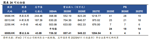 我们取同属于恒生行业分类下,制药子行业中与博安生物业务及收入体量相近的生物技术公司再鼎医药、和黄医药、和誉-B作为可比公司,预计行业2025~2027年平均PS为24X、18X、14X,博安生物为5X、4X、3X,低于行业平均水平,且公司率先扭亏,具有更大投资价值。
