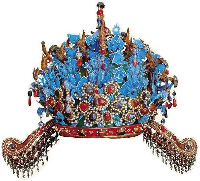 内蒙古博物院收藏了一件清代点翠凤冠,凤冠先用金属丝做骨架定型,在骨架上装饰十四只点翠铜鎏金凤,凤口中衔珍珠串,九朵点翠铜鎏金牡丹花,花蕊的材质有松石、玛瑙等。整副头冠嵌满各色宝石、珍珠,脑后配一双点翠发簪和一双点翠珍珠串步摇。走起路时,凤冠上的步摇和凤凰、花蝶随之摇摆,无比华美。