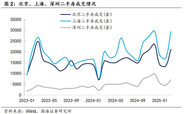 北京2025年3月二手房日均成交682套,同比增长34%,相较2024年12月的高点下降10%;2025年3月上海二手房日均成交947套,同比增长45%,较2024年12月的高点下降1%;2025年3月深圳二手房日均成交227套,同比增长52%,相较2024年12月的高点下降28%。相比之下,新房市场整体动能趋缓,从2025年3月一线城市新房日均成交套数来看,北京相较2024年12月高点下降9%,上海、广州、深圳则下降28%-58%。