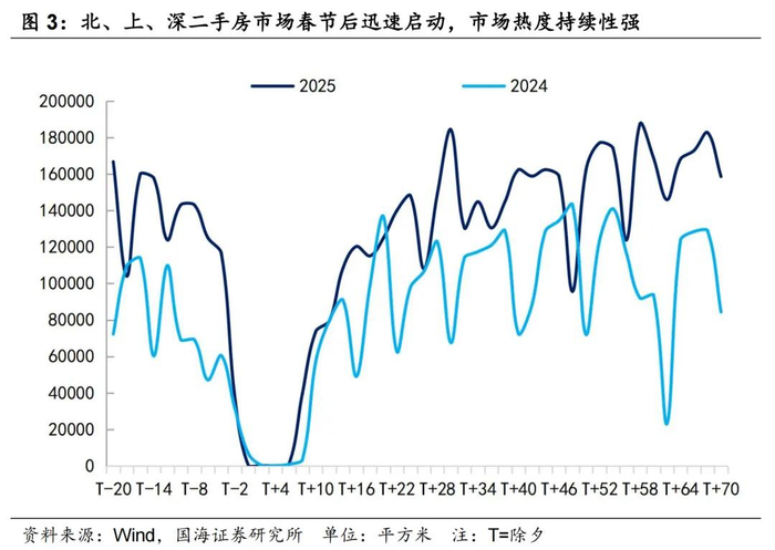 其中,放松限购起到关键作用。核心城市房地产市场表现优于其他地区,主要因为过去核心城市住房交易在限购上有严格的限制,其政策强度与执行力度、执行时间均远超三四线城市。2024年926后,一线城市才大幅放松限购限制,调控晚于三四线城市,故至今仍处于政策红利期。2024年四季度一线城市新建商品住宅销售面积环比增长45%。其中,广州全面放开限购,深圳缩小限购区域,两地新房销售面积同比分别增长69%和124%,市场修复速度明显快于其他城市。上海外环外限购政策相对宽松,外环外的新房成交成为市场主力,四季度外环外新房成交量占比全市的79%。二手房市场,一线城市在限购放松后二手房成交量持续处于高位,2025年春节后北上深二手房成交量相较去年同期恢复更迅速,市场热度持续性强。