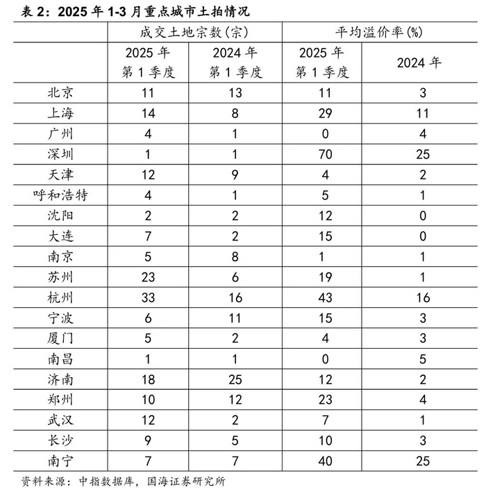 今年以来,北上广深等一线城市及杭州、成都等强二线城市房地产市场热度较高,与之对应的土地市场热度提升。2025年3月,北京、杭州土拍市场分别拍出住宅单价地王,溢价率达28%、115%。2025年一季度各地住宅用地土拍溢价率普遍回升,北京土拍平均溢价率提升至11%、上海和深圳分别为29%、70%,显著高于2024年溢价水平,杭州、成都等房地产市场恢复较快的核心城市,土拍溢价率也提升明显,分别达43%、27%,反映了房企对市场信心的增长。