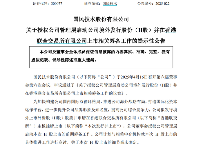 4月16日晚间,国民技术发布公告称,为加快构建公司国内国际双循环格局,推进公司海外战略布局,打造国际化资本运作平台,进一步提升公司品牌形象及知名度,提高公司综合竞争力,公司拟发行境外上市外资股(H股)股票并申请在香港联交所主板挂牌上市,公司董事会授权公司管理层启动本次H股上市的前期筹备工作。