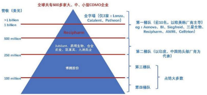 根据广发证券研报,全球视野下,Lonza、Catalent、Patheon、Aenova、BI、Siegfreid、三星生物、Recipharm、AMRI、Celltrion等欧美韩企业规模领先、体量庞大,占据主导地位。