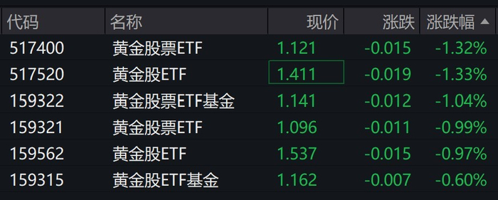 受盘面影响,跟踪中证沪深港黄金产业股票指数的ETF集体翻绿跌约1%。