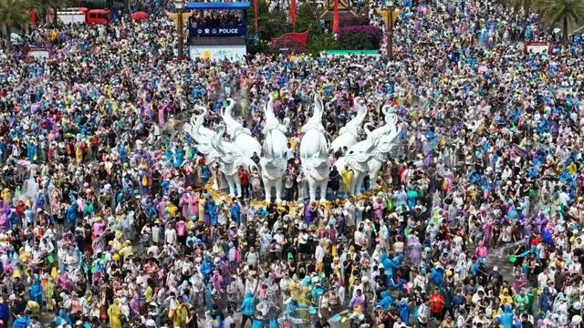 4月12日至16日,众多中外游客和西双版纳各族群众共度傣历1387年新年节,畅享“东方狂欢节”泼水激情大戏。