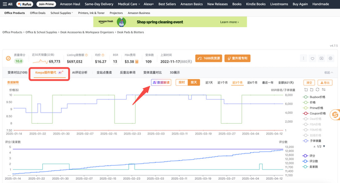 网页端:登录卖家精灵官网 → 【查竞品】/【选产品】→ 点击查看Keepa趋势 → 点击“AI数据解读”插件端:安装卖家精灵插件 → 进入亚马逊Listing页 → 点击“Keepa插件替代” → 点击“AI数据解读”