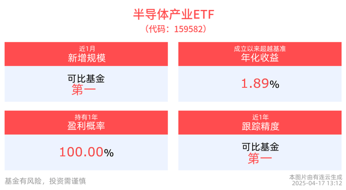 跟踪精度方面,截至2025年4月16日,半导体产业ETF近1年跟踪误差为0.057%,在可比基金中跟踪精度最高。