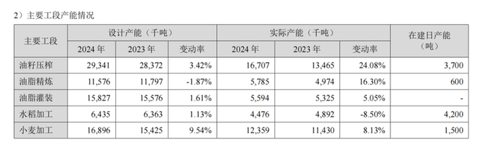 2024年年报显示,油籽压榨设计产能2934.1万吨,但实际产能仅为1670.7万吨;油脂精炼设计产能1157.6万吨,实际产能578.5万吨。此外,油脂灌装、水稻加工、小麦加工的实际产能,均远低于设计产能。