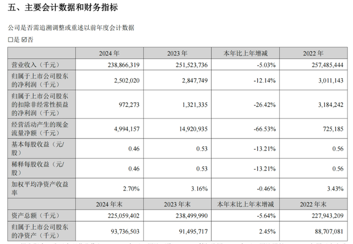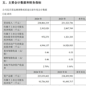 金龙鱼近期发布的2024年财报显示,2024年,公司实现营业收入2388.66亿元,同比下降5.03%;归属于上市公司股东的净利润25.02亿元,同比下降12.14%;归属于上市公司股东的扣除非经常性损益的净利润9.72亿元,同比下降26.42%。