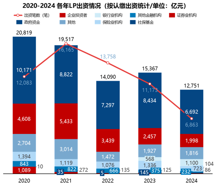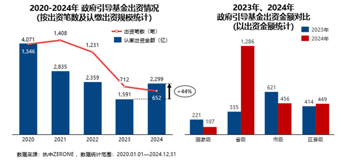 国资LP也走出了分化趋势。其中,政府引导基金在2024年逆势扩容,出资额不降反增,达2299亿元,同比增长44%。