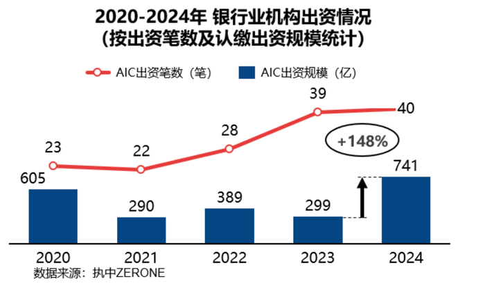 《报告》显示,2024年,银行业机构出资规模达756亿元,同比大幅增长137%,出资规模为近5年最高。这其中,银行AIC贡献了绝大部分的出资额,达到741亿元。