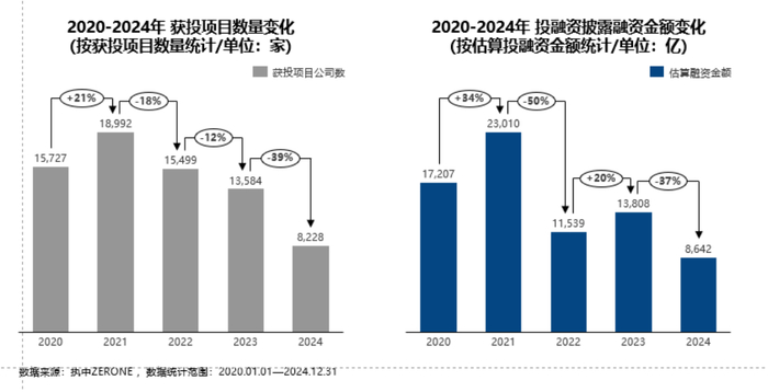 在投资端,机构LP的资金在2024年流向了8228家公司,获投公司数量同比下降39%;可估算融资金额8642亿元,同比下降37%。