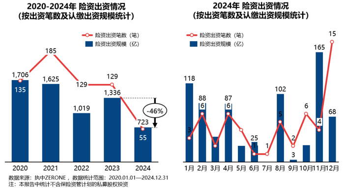 同样被寄予厚望的“长钱”——险资,在2024年的出资规模和出资笔数则为近五年来最少,其出资规模为723亿元,同比下降46%;出资笔数仅为55笔,近五年来首次跌进两位数。