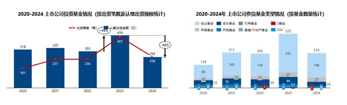 其他机构LP方面,上市公司2024年出资金额出现大幅下滑:231家上市公司共计出资258笔,笔数同比下降39%;出资金额254亿元,金额同比下滑42%。这一变动或与资本市场波动(如IPO放缓)、部分行业产能过剩导致的投资审慎有关。未来随着并购重组政策松绑和产业升级需求,预计上市公司将加大与产业资本联动力度。