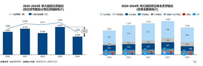 国资方面,2024年,地方国资参投基金数量出现了首度下降,降幅为19%。而在此前,2020-2023年期间,地方国资参投基金数量持续上升,2021年较2020年增加幅度较大超过20%,此后两年也以年均6%左右的比例提升。