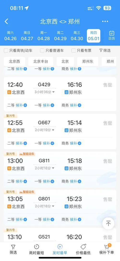 今早8点,北京西站、北京丰台站率先开票,记者登录12306查询5月1日车票发现,北京到郑州、太原、石家庄等方向的中短途行程,开票几分钟就只剩“无座票”,去往长沙、武汉、西安、成都等热门旅游目的地的热门车次也“秒光”,不少车次后都标记了“售罄”字样。“12306候补”也冲上微博热搜。