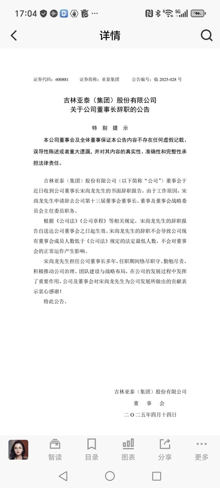 面对连年亏损和债务逾期的多重压力,亚泰集团创始人等高层选择“集体辞职”。4月13日,亚泰集团(600881.SH)发布多起公司管理层人事变动公告。公告表示,公司收到董事长宋尚龙,董事孙晓峰、翟怀宇,监事会主席陈继忠、监事会副主席张秀影及监事陈亚春的书面辞职报告。值得一提的是,今年72岁的宋尚龙是亚泰集团的创始人,自1999年4月担任集团董事长,任职时间达26年。