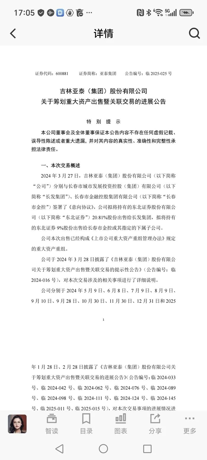 深陷亏损负债泥潭的亚泰集团,为了优化资产负债结构,开始谋求出售东北证券股份。去年3月,东北证券发布公告显示,亚泰集团计划出售所持东北证券29.81%的股份。一旦此次交易顺利完成,亚泰集团在东北证券的持股比例将锐减至1%。2025年3月29日,亚泰集团再度发布公告,出售东北证券股份事项,同各相关方持续沟通协商,并积极推进尽职调查等相关工作。
