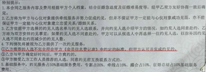 范晓红发现,合同将服务质量的责任转移给了消费者,存在“约见即视为服务完成”条款。即使推荐对象明显不符合消费者的择偶要求,只要消费者未当场拒绝见面,婚介机构即可主张已履行合同义务。
