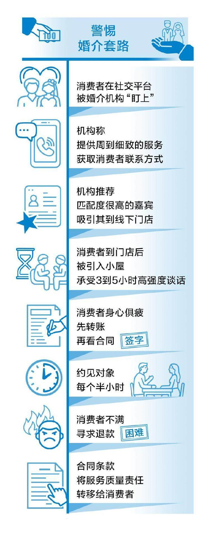 婚介机构怎么了?记者深入调查并采访多个消费者得知,不良婚介机构潜伏在社交平台,依然在利用焦虑“围猎”单身人群。当消费者走进婚介线下门店,一系列套路就将围绕“猎物”展开。