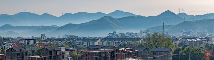 这是4月1日在浙江省安吉县余村拍摄的乡村民居,覆盖竹林的远山与风格一致的建筑相得益彰。(拼接图片)