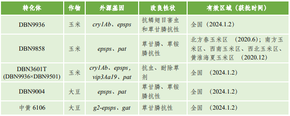 现已批准登记的生物育种作物配套的除草剂产品中,涉及的转化体主要是大北农(玉米转化体:DBN9858、DBN9936、DBN3601T;大豆转化体:DBN9004);以及中国农业科学院作物科学研究所的大豆转化体中黄6106。
