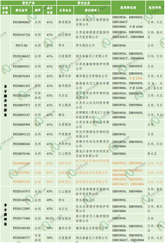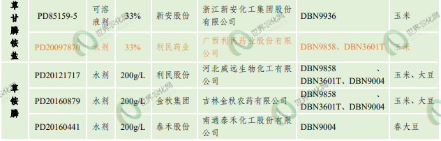 福阿母韩农方面,东部韩农(黑龙江)生物科技有限公司的41%草甘膦异丙胺盐水剂已在转基因玉米转化体DBN9936、DBN9858,以及转基因大豆转化体DBN9004上取得登记。