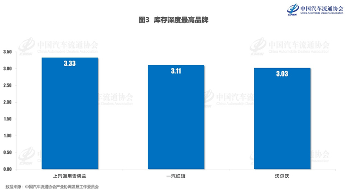 调查显示,3月份有11个品牌的库存系数超过2个月。其中库存深度最高的三个品牌为:上汽通用雪佛兰、一汽红旗、沃尔沃。