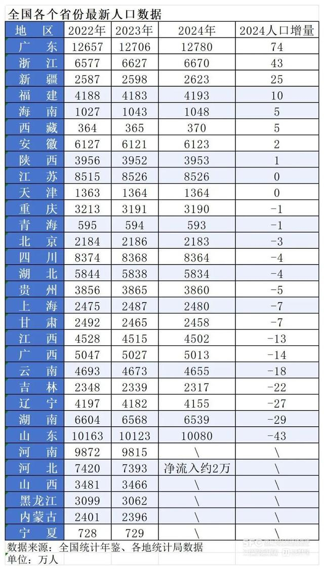 从常住人口变动情况来看,整体呈现出分化态势。9 个省份常住人口实现增长,其中广东以 74 万的增量和出生人口全国首位的成绩,连续 18 年蝉联中国人口第一大省,彰显出强大的人口吸引力。浙江则凭借 45.4 万人的省外净流入,在增长方面一马当先。与之形成鲜明对比的是,18 个省份常住人口出现减少。例如山东减少 42.8 万、河南减少 30 万等。在中部六省中,仅安徽 2024 年常住人口呈正增长,即便其人口自然减少 13.7 万,但 15.7 万的新增跨省净流入人口使其实现了增长。值得注意的是,四大直辖市在 2024 年集体陷入人口困境,三个常住人口减少,一个持平,无一增长。东北区域人口负增长现象进一步加剧,辽吉蒙三省区常住人口总量均减少,不过受生育政策影响,出生人口有所回升。而西藏以 13.87‰的人口出生率位列全国第一,贵州、青海等地出生率也超过 10‰。