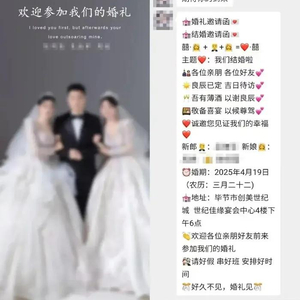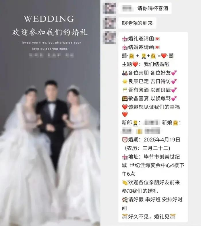 4月17日,一张特殊的婚礼请柬在社交平台广泛传播。请柬显示,贵州毕节男子吴某计划于4月19日与两名女性(周某、陈某)同时举办婚礼,并附有三人婚纱照及婚妆视频。