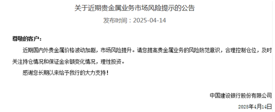 建设银行近日也在官网发布了关于近期贵金属业务市场风险提示的公告,提示贵金属价格波动加剧,市场风险提升。