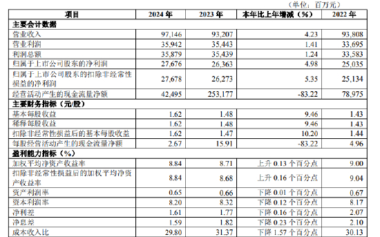 报告期内,实现营业收入971.46亿元,同比增长4.23%;实现利润总额358.79亿元,同比增长1.24%;实现归属于上市公司股东的净利润276.76亿元,同比4.98%。