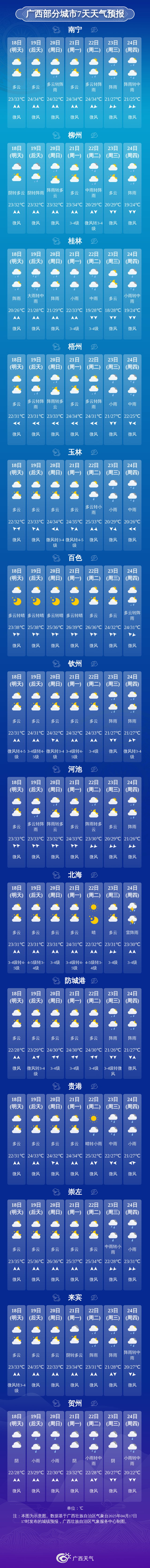 今天晚上到明天白天,河池、柳州、桂林等市部分地区多云到阴天有阵雨或雷雨、局地中到大雨,其它地区多云到晴。南宁市:今天晚上到明天白天,多云、局地有阵雨,偏南风2~3级,最低气温23℃,最高气温33℃。