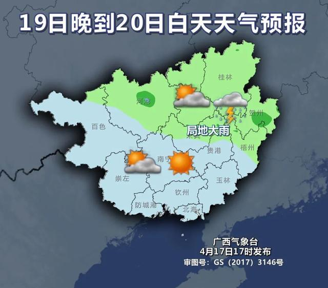 19日晚上到20日白天,桂北部分地区多云有阵雨或雷雨、局地大雨,其它地区多云到晴。