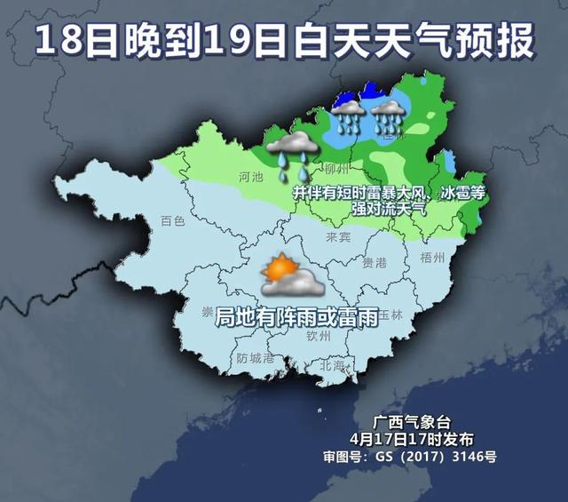 18日晚上到19日白天,桂东北部分地区有中雨、局地大雨到暴雨并伴有短时雷暴大风、冰雹等强对流天气,其它地区多云、局地有阵雨或雷雨。