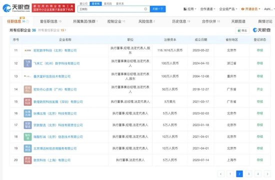 商业履历信息显示,王树彤名下共关联36家企业,其中大多数为存续状态,包括驼铃(广州)国际贸易有限公司、纵横出海(北京)科技有限公司、数贸科技(上海)有限公司等。