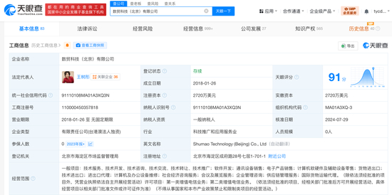 天眼查App显示,敦煌网关联企业数贸科技(北京)有限公司成立于2018年1月,法定代表人为敦煌网创始人王树彤,注册资本为2720万美元,经营范围包括软件开发、通讯设备销售、电子产品销售、计算机软硬件及辅助设备零售、供应链管理服务等,由数字贸易(香港)有限公司全资持股,最终受益人为王树彤。