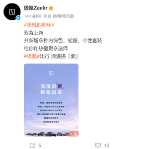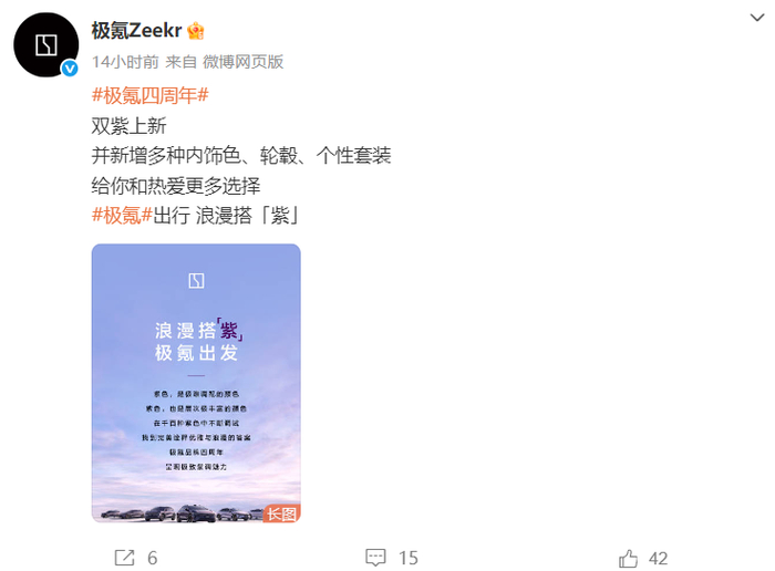 4月17日,极氪宣布推出“双紫上新”限时活动,新增暗夜紫、星际紫两款紫色车漆以及冰川银配色,覆盖极氪007 GT、极氪7X、极氪009等多款车型,限时免费选装。
