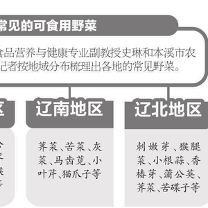 史琳告诉记者,辽宁地区比较常见的可食用的野菜资源共有23科61属79种,按食用部位又可分为苗菜类、花菜类和嫩叶类3种。其中苗菜类野菜主要以植物的幼苗或嫩茎为食用部分,口感鲜嫩,营养丰富,常见的苗菜类野菜是苣荬菜、蒲公英、灰灰菜、小根蒜等;花菜类野菜以花朵或花序为食用部分,多具有独特香气或风味,如槐花、榆钱等;嫩叶类野菜以植物的嫩叶或嫩梢为食,常需焯水去涩,如香椿、蕨菜、大叶芹、马齿苋等。