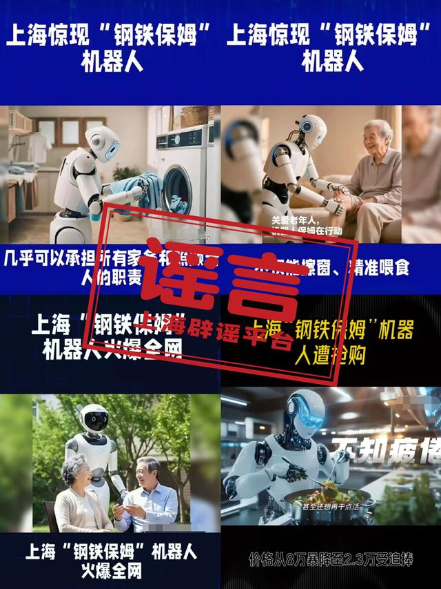 最近,社交平台出现不少“上海老人疯抢2.3万元保姆机器人”的文章和短视频。有自媒体称:“保姆机器人可以洗衣做饭、拖地洗碗、辅导作业、照顾老人等等,引发上海全城抢购,预约订单已排至半年后。”还有自媒体绘声绘色描述了所谓的“抢购现场”,并称保姆机器人是“钢铁孝子”。