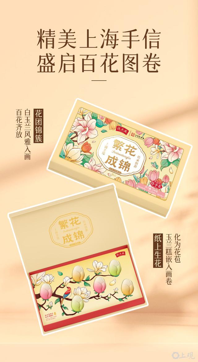 礼盒上,白玉兰摇曳生姿,其他花卉衬托在旁,绘制成一幅百花图卷。打开礼盒,一幅玉兰枝头的画卷映入眼帘,6枚白玉兰型茶点嵌入在画卷中,幻化作枝头饱满欲坠的“花苞”,极其雅致。糕点的制作沿用了沈大成传承百年的非遗点心技艺,并根据上海国际花展的主题推陈出新,特别定制了三款口味的花茶风味糕点:玫瑰色花型,是经典的金沙口味,再添一份玫瑰芳香;淡绿色花型,让茉莉香邂逅龙井绿,自显一派轻灵淡雅;淡黄色花型,在醇厚的乌龙茶香上融入金桂,更具馥郁之感。