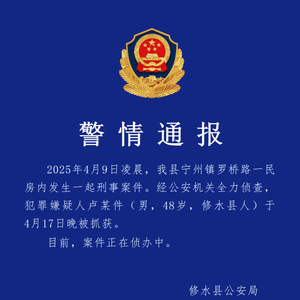 新京报讯 据修水县公安局微信公众号消息,4月9日凌晨,该县宁州镇罗桥路一民房内发生一起刑事案件。经公安机关全力侦查,犯罪嫌疑人卢某件(男,48岁,修水县人)于4月17日晚被抓获。目前,案件正在侦办中。