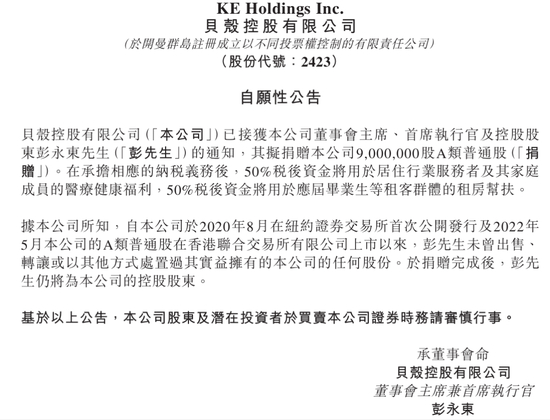 4月17日晚,在贝壳董事会主席兼首席执行官彭永东“7.13亿天价年薪”舆情全网发酵后,贝壳的大手笔公关来了。贝壳先是紧急发布了一则自愿性公告,宣布彭永东拟捐赠贝壳900万股A类普通股,分别用于对居住行业服务者及其家庭的医疗健康福利帮扶和应届毕业生等租客群体的帮扶。