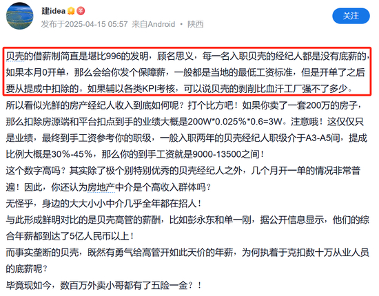 昨晚,笔者跟一位武汉的贝壳平台经纪人就相关薪酬话题还专门交流过,按他的说法:“链家借薪“属实,他所在的贝壳加盟店,也是“店东责任制”,员工薪酬由店东制定,他所在的店也没有底薪,提成70%。